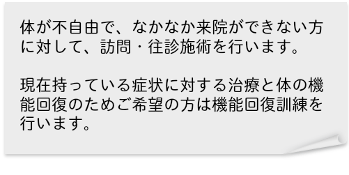 現在院内での施術が予約でいっぱいのため往診は特別な場合を除き一時休止しています。