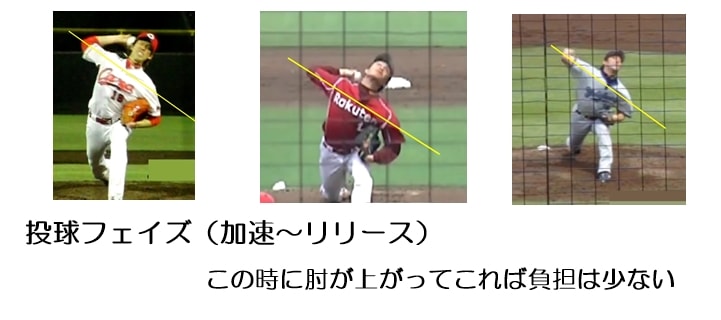体が回転しリリースに向けてボールが後ろへと取り残されているところでは肘が上がっていないと肘にかなりの負担がかかります。