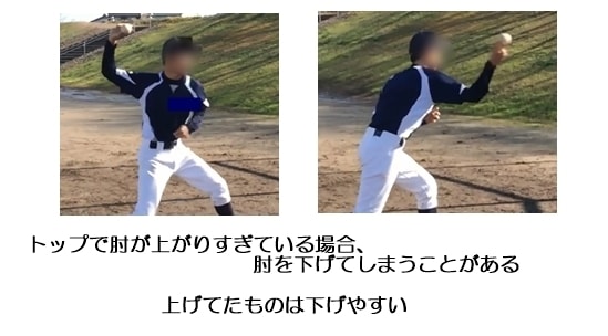 また逆にトップで肘が上がりすぎている場合こういうことが起きる可能性があります。