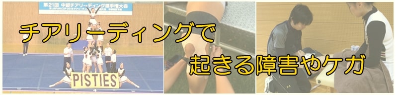 チアリーディングは、スタンツという組体操のような演技があり、人を体の上にのせる、人を投げ上げる、落ちてくる人をキャッチするといったかなり体に負担のかかる動作があるので、腰や肩に痛みを出してしまうことがあります。またダンスや特殊なジャンプを行う際の着地などでも足の障害やケガが起こります。
